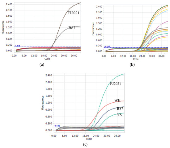 Specificity of the one-step real-time TaqMan RT-PCR assay. (a) FJ2021 and B87 strains were the positive controls for VIC and FAM signals, respectively; IBV, NDV, AIV, ILTV, FPV, M. gallisepticum, M. synoviae, and IBDV-negative field samples did not show amplification signals for VIC or FAM during the assay. (b) Six nVarIBDV strains, BC6/85, and seven vaccine strains were analyzed to specifically generate the amplified VIC signal and FAM signal, respectively. (c) Two vvIBDV strains (WH and YS) were analyzed to specifically generate the amplified FAM signal.