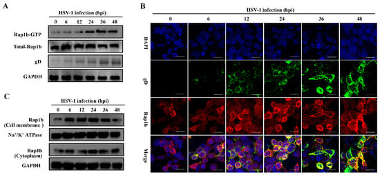 By monitoring the Rap1b activation mode during HSV-1 infection, we found that total and activated Rap1b increased from an early stage with similar growth and decline trends (Figure 1A). Upon HSV-1 infection, the total amount of Rap1b protein was significantly up-regulated, peaking at 6 hpi and slightly decreasing at 12 hpi to levels still significantly elevated compared to the uninfected control. Rap1b activation (Rap1b-GTP) also increased at 6 hpi and continued to increase to a peak at 36 hpi and a plateau at 48 hpi. This difference between total protein up-regulation and activation dynamics suggests posttranslational modifications. We next assessed Rap1b activation and cellular localization using confocal microscopy. Rap1b is gradually recruited to the cell membrane after infection, peaking at 24 hpi (Figure 1B), which is consistent with the Rap1b activation dynamics on the cell membrane and in the cytoplasm (Figure 1C).
