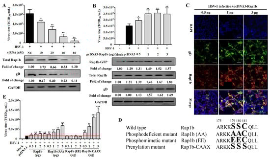 Having established a correlation between HSV-1 infection and Rap1b expression, we next assessed whether Rap1b inhibition with siRNA could impair viral infection. As expected, viral infection was inhibited with siRNA in a dose-dependent manner. After the knockdown of Rap1b expression (≈80%), viral infection was reduced by 90% (Figure 2A). Viral titers were rescued via Rap1b plasmid transient overexpression but without a clear dose–response phenotype, even though the total Rap1b protein increased significantly during virus infection (Figure 2B,C). In contrast, the changing trend synchronous with total Rap1b is not captured at Rap1b-GTP assessment but is similar to the results of virus titration and gD protein expression, suggesting that there is a mechanism to inhibit the activation of Rap1b.