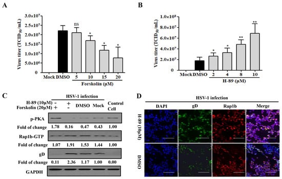 The phosphorylation of the upstream limiting factor PKA in Rap1b is connected to the membrane-remodeling-related physiological process []. By recruiting the PKA agonists forskolin and H-89 in HSV-1-infected cells, a desired decline and increase in virus infection were both detected in a dose-dependent manner (Figure 3A,B). Consistently, the PKA agonist forskolin counteracted HSV-1 infection-induced PKA dephosphorylation and significantly restored PKA phosphorylation with less Rap1b activation and viral gD protein (Figure 3C). Conversely, dephosphorylation of PKA concomitant with increased Rap1b activation and viral gD protein was prominently reversed with the participation of PKA inhibitor H-89 (Figure 3C), which was further proved through visual differences using confocal microscopy (Figure 3D).