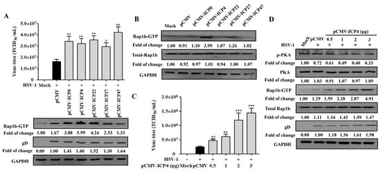 Due to the activation characteristics of Rap1b-GTP increase and membrane enrichment since the early stage of HSV-1 infection, we proposed the spontaneous hypothesis that the achievement of Rap1b activation was associated with HSV-1 IE genes. As shown in Figure 4A, the correlation between Rap1b activation and a specific IE gene has not yet been obtained, and all five IE genes exhibited the ability to promote viral infection. Subsequent data from cells transfected with different IE-gene-related plasmids without virus infection suggested that ICP4, and perhaps ICP27, showed a significant role in promoting the activation of Rap1b (Rap1b-GTP) without HSV-1 infection, which may allow the virus to infect through Rap1b activation more efficiently (Figure 4B). In addition, further experiments with different amounts of the ICP4 plasmid also showed dose–dependent promotion of HSV-1 infection, as shown above (Figure 4C). More importantly, with the increase in ICP4 plasmid transfection, PKA dephosphorylation and Rap1b activation showed a significant increase, accompanied by more gD protein and total Rap1b expression, when compared with HSV-1-infected cells transfected with the control plasmid (pCMV) (Figure 4D). Overall, these observations suggest that the HSV-1 IE gene ICP4 may dominate or partially promote Rap1b activation during virus infection through the inhibition of PKA phosphorylation.