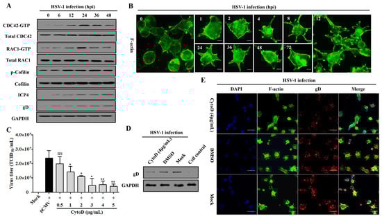 The Rho family proteins CDC42 and RAC1 are participants in confusing mechanisms during HSV-1 infection [,], but our previous work has elucidated their causal relationship in response to Rap1b activation in membrane remodeling [,]. Here, the Cofilin protein, a direct executor downstream of CDC42 and RAC1 for the conversion of actin monomer (G-actin) and polymer (F-actin), was strongly activated with the activation of CDC42 and RAC1 in a time-dependent manner [,,] during the whole process of HSV-1 infection, which was accompanied by the increased expression of ICP4 and gD proteins (Figure 5A). As a result, Cofilin mediated skeleton-based membrane remodeling with dynamic change that was visually observed at different points after infection (Figure 5B), which is consistent with the activation of the cascade signal pathway (Figure 5A). Consistent with the above results, treatment with CytoD, an F-actin inhibitor that restricts its depolymerization [], also inhibited virus infection in a dose-dependent manner (Figure 5C). Furthermore, the virus infection decreased with attenuated cell remodeling under the action of an inhibitor (Figure 5D,E).