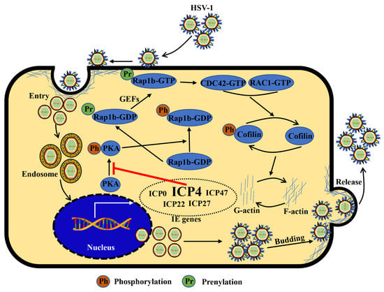 Due to the diversified functions of ICP4, including the cytoskeleton’s regulation ability, ICP4 may be associated with the HSV-1 infection process involving the cell membrane [,,,]. That said, its mechanism is unknown. Interestingly, Rap1b, characterized by its spatiotemporal expression manner (dynamic transfer of cytoplasm and intima) during activation state transition, has been firmly identified as being related to normal physiological processes, tumorigenesis, and viral infection resulting from its regulation of membrane dynamic changes [,]. Meanwhile, epithelial cells, as the primary site of HSV-1 infection, are crucial for the establishment of infection [], and blocking the primary infection at this site may also be the most effective way to prevent infection. Therefore, a hypothesis about how Rap1b responds to ICP4 to regulate membrane-involved infection emerged spontaneously; this paper presents evidence for the proposed model on HSV-1-infected human corneal epithelial cells. The results indicate that HSV-1 infection promoted the membrane enrichment of Rap1b, leading to the activation of CDC42 and RAC1, as well as the frequent conversion of Cofilin between its activated (dephosphorylation) and deactivated (phosphorylation) states [], which in turn promoted membrane remodeling dominated by F-actin, thus promptly infecting the virus. After screening five HSV-1 IE genes, we determined that ICP4 is likely responsible for the activation of Rap1b, and this is achieved by inhibiting the activation of the phosphorylation restriction factor PKA [], allowing for effective viral infection. These findings will provide a novel therapeutic avenue to block HSV-1 persistence and recurring symptoms, enabling the prevention of neurological disease from primary infection sites.