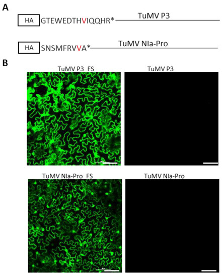 Turnip mosaic virus (TuMV), a member of the genus Potyvirus in the family Potyviridae, is a predominant pathogen of cruciferous crops causing significant yield losses [30]. The genome of TuMV is a single-stranded positive-sense RNA of ~10.0 kilobases, encapsidated in 700 to 750 nm long flexuous filamentous particles. TuMV encodes a single large open reading frame that is translated into a large polyprotein, which was processed into at least 10 mature proteins by the virus-encoded P1 protein [31], the helper-component proteinase (HC-Pro) [32], and the nuclear inclusion body a protein protease (NIa-Pro) [33,34]. Though TuMV is thoroughly studied for viral genes functions, vector transmission, and virus–host interactions [35,36,37,38], TuMV-encoded SIE determinants have yet to be identified.