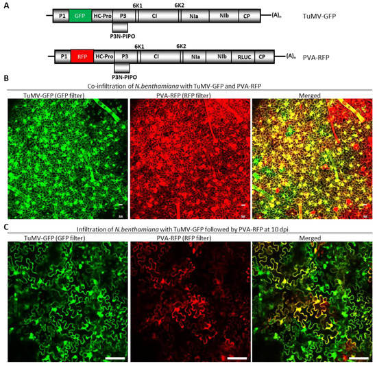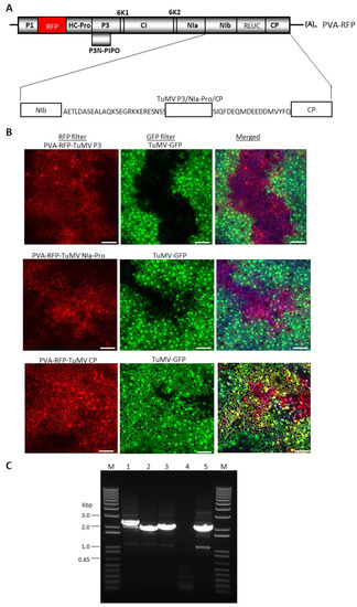 3.4. TuMV-GFP and PVA-RFP Readily Co-Infect the Same Cells