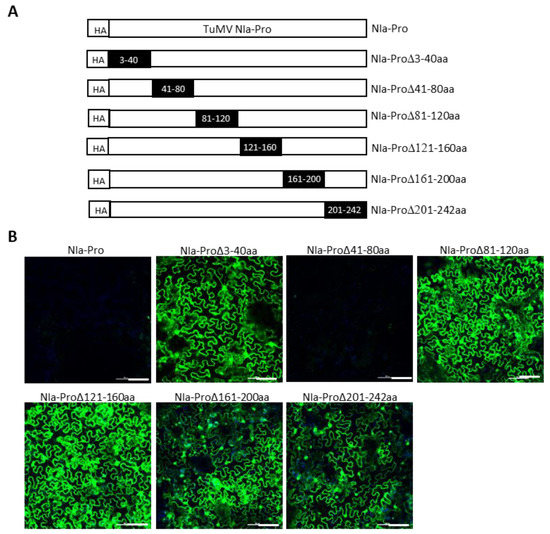 We next attempted to delineate the minimal regions of TuMV P3 and NIa-Pro required for SIE elicitation. This was undertaken by introducing a series of nonoverlapping deletions with HA-TuMV P3 and HA-TuMV NIa-Pro. In P3, nine deletions encompassing amino acid residues 3 to 40, 41 to 80, 81 to 120, 121 to 160, 161 to 200, 201 to 240, 241 to 280, 281 to 320, and 321 to 352 were generated (Figure 6A). Similarly, six deletions were introduced into the NIa-Pro, encompassing amino acid residues 3 to 40, 41 to 80, 81 to 120, 121 to 160, 161 to 200, and 201 to 242 (Figure 7A).