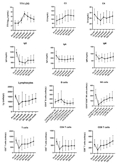Evolution of TTV viral load (log10) and immunological parameters from baseline assessment to the 12th month after transplant. Results are presented as median and interquartile range. KT—kidney transplant.