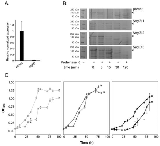 The Hrr. lacusprofundi ∆aglB strain shows altered growth and increased protease sensitivity of the S-layer. (A) Validation of aglB deletion by qPCR. The relative mRNA expression of aglB (Hlac_1062) was normalized to that of a housekeeping gene (16S rRNA). The values presented are the average of four technical repeats ± standard error of the mean. (B) Parent and ∆aglB cells were challenged with 0.2 mg/mL proteinase K at 37 °C for the indicated times (min). Precipitated cellular proteins are visualized on 8% acrylamide SDS-PAGE gels for one representative replicate (out of three biological replicates) from the parent strain and three biological replicates from the ∆aglB strain. The position of the S-layer glycoprotein is indicated with an arrow. (C) The growth of parent (circles) and ∆aglB (triangles) strains was monitored in media with NaCl concentrations of 120 g/L (2.05 M, light grey), 180 g/L (3.1 M, dark grey) or 240 g/L (4.1 M, black). Each point represents the average of three biological replicates ± standard deviation of the mean. The data were generated simultaneously for both strains across NaCl concentrations in a separate experiment to the data shown in Supplementary Figure S2. Asterisks indicate when cultures went into biofilm and OD600 could no longer be accurately measured.