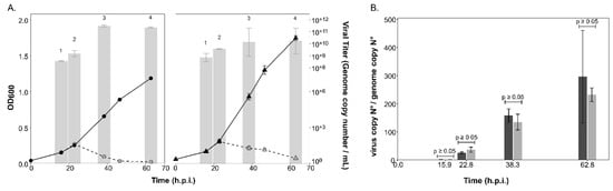 Infection with the HFPV-1 virus led to a slight growth retardation during early exponential growth (ca. 25 h.p.i.) of both the parent and ∆aglB strains (Figure 4A). HFPV-1 causes a productive chronic infection, in which viral particles are released by extrusion or by budding through the cell membrane without lysis of the host [39,60]. Viral titers in the culture supernatant did not show a sharp increase, as observed after lysis of HRTV-DL1-infected cultures, but rather remained within similar orders of magnitude (10+7–10+8) throughout growth, although titer values did decline over time. Interestingly, we detected significant differences in viral titer between strains, with consistently higher titers being recorded for the ∆aglB strain. Maximal viral genome copy numbers per ml were three times higher (p = 0.0001; Figure 4A) for the mutant strain (6.42*10+8 ± 4.8*10+7, n = 3) at 44 h.p.i than in the parent strain (1.89*10+8 ± 2.4*10+7, n = 3). Intracellular virus:host genome ratios remained consistently below one for both strains (Figure 4B, Supplementary Figure S3B), yet were higher in the mutant strain with a statistically significant difference (e.g., p = 0.0009 at 44 h.p.i), except at the last time point, displaying a consistent pattern with the viral titers in the culture supernatants.