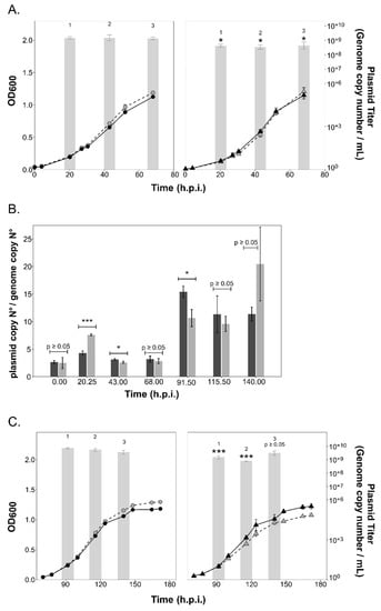 Growth of the parent and ∆aglB strains and plasmid titers during infection with plasmid pR1SE. (A) Growth of uninfected (black, solid line) and infected (grey, dashed line) cultures of Hrr. lacusprofundi parent (circles) and ∆aglB (triangles) strains over time (0–68 h.p.i.) Plasmid titer of pR1SE in the culture supernatant (genome copy number/mL) are shown as bar graphs in logarithmic scale (log base 10). Data points and bars represent the average of three biological replicates (n = 3) ± standard deviation of the mean. Statistical significance is indicated in the graph above the values for the ∆aglB strain, with the following significance codes: ‘***’ for p < 0.001, ‘*’ for p ≤ 0.05 and p ≥ 0.05. (B) Plasmid pR1SE genome copy numbers normalized to the level of the main host chromosome within cells. Bars represent the average of three biological replicates (n = 3) ± standard deviation of the mean for parent (dark grey) and ∆aglB (light grey) strains. Statistical significance is indicated in the graph using the same significance codes described above for (A). (C) Continued growth of cultures after dilution of the cultures shown in (A) with the same graphical representation and statistical analysis.
