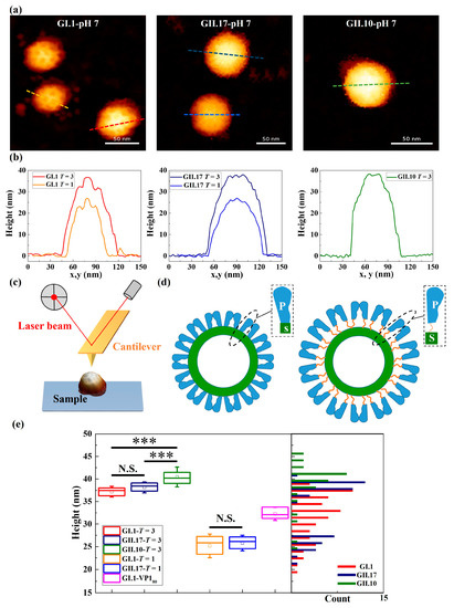 NoroVLPs of the measured variants showed a broad size distribution with multiple peaks (the histogram in Figure 1e), indicating various assembly types under neutral conditions. To assign the noroVLPs to the corresponding assemblies (T = 1 or T = 3), the size distribution of GII.17 noroVLPs was used as a base line. The size distribution of GII.17 noroVLPs was used for the height cut-off values because the morphology of GII.17 at different pH values has been studied well and the assembly state remains unaltered [11]. Furthermore, the size distribution of GII.17 noroVLPs demonstrated a clear bimodal shape in the histogram (Figure 1e). The figure reveals that GII.17 existed in the larger T = 3 and the smaller T = 1 assemblies, in line with previously published mass spectrometry (MS) results [11] under neutral conditions. For noroVLPs of GI.1, a third subpopulation could be observed around the cut-off sizes of T = 3 and T = 1. These intermediate particles are assumed to belong to VP180 assemblies, i.e., particles composed of 80 VP1 monomers [37].