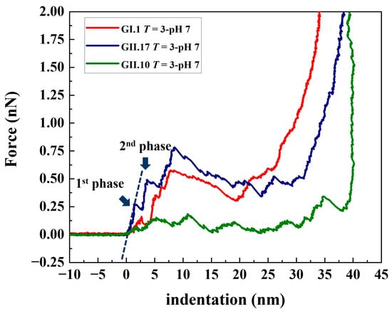 In contrast to the critical force and spring constant, we can find a significant difference in critical indentation exclusively at the first phase of the F-D curves (Figure 4a). No significant differences existed in the second phase. In the first phase, the critical indentations of GI.1 and GII.17 were significantly less than the critical indentations of GII.10. The difference in the first critical indentation between GII.10 (T = 3 assemblies of GII.10: 5.2 ± 0.5 nm) and the other two variants (T = 3 assemblies of GI.1: 3.2 ± 0.4 nm; T = 3 assemblies of GII.17: 2.9 ± 0.4 nm) was around 2 nm.