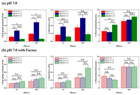 Fucose treatment diminished the original differences in the mechanical properties of the tested variants. The mechanical properties of noroVLPs at (a) pH 7.0 and (b) pH 7.0 after incubating with fucose were acquired from three independent measurements. The vertical column represents the mean, and the error bar represents the standard error of the mean. A one-way ANOVA test was used for significance analysis. p values are indicated by asterisks: p < 0.001 (***), p < 0.01 (**), p < 0.05 (*), and not significant (N.S.).