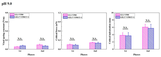 Alkaline treatment affected the mechanical properties of GI.1 and GII.17, leading to a similar mechanical performance of the two variants. The mechanical properties of noroVLPs of GI.1 and GII.17 at pH 9.0 were acquired from three independent measurements. The vertical column represents the average, and the error bar represents the standard error of the mean. A one-way ANOVA test was used for significance analysis. No significant (N.S.) indicates the p value is larger than 0.05.
