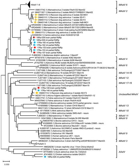 Phylogenetic analysis of partial RdRp nucleotide sequences of AstVs. The phylogenetic tree was generated using the neighbor-joining method with p-distance and bootstrapped with 1000 replications. Sequences of raccoon dog AstVs are labeled as follows: (●) detected in brain tissue, (●) detected in intestine tissue, (◆) reported in China.
