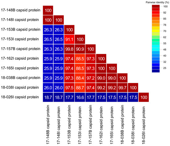 To clarify the genetic characteristics of AstV detected in wild raccoon dogs in Korea, we performed a similarity analysis on the amino acid sequence of the capsid protein obtained through the ORF2 gene (Figure 2). Amino acid homology among Korean raccoon dog AstV strains ranged from 16.6% to 100%, showing significant differences in some strains. The amino acid capsid protein sequence identity between AstVs detected in the brain and in the intestine of the same raccoon dog was 100% between 17-148B and 17-148I, 91.1% between 17-153B and 17-153I, and 99.7% between 18-038B and 18-038I. The capsid protein amino acid sequence similarity between 17-157B and 17-153I strains, which showed 100% nucleotide sequence identity to the partial RdRp gene, was found to be 90.9%. In addition, raccoon dogs AstVs 17-148B, 17-148I, and 18-026I showed significant differences in capsid protein amino acid sequences, with 16.6% to 26.3% similarity compared to other raccoon dog AstVs in Korea.