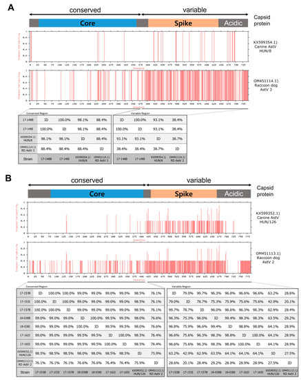 Variability and similarity of AstV capsid proteins between canine and raccoon dog strains. (A) Comparison of capsid proteins of 17-148B, 17-148I, canine AstV HUN/8, and raccoon dog AstV 3. (B) Comparison of capsid proteins between raccoon dog AstV strains belonging to MAstV5 and canine AstV HUN/126.