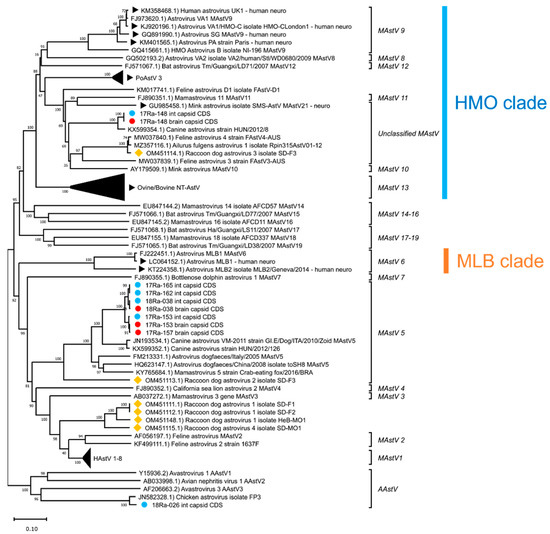 - Bouzalas, I.G.; Wüthrich, D.; Selimovic-Hamza, S.; Drögemüller, C.; Bruggmann, R.; Seuberlich, T. Full-genome based molecular characterization of encephalitis-associated bovine astroviruses. Infect. Genet. Evol. 2016, 44, 162–168. [Google Scholar] [CrossRef]