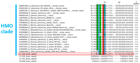 Conserved region of the Q(I/L)QxR(F/Y) motif in HMO clade NT-AstVs capsid protein amino acid sequences (marked in color). The red box indicates the raccoon dog AstV 17-148B strain detected in raccoon dog brain tissue in South Korea, which belongs to the HMO clade.