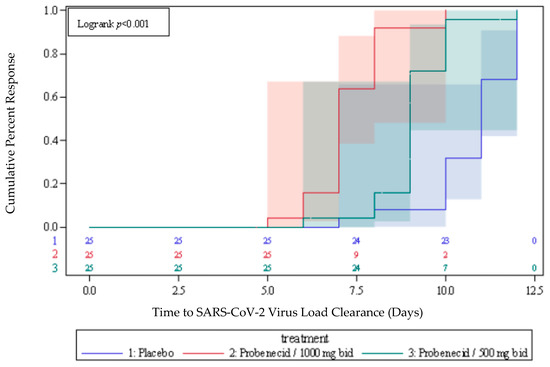 The time to clearance of virus RNA in nasopharyngeal swabs (<250 copies/mL) was the primary endpoint of this study and was significantly shorter for the probenecid 1000 mg group versus placebo (median of 7 days vs. 11 days, respectively; log-rank p < 0.0001), and for the probenecid 500 mg group versus placebo (median of 9 days vs. 11 days, respectively; log-rank p < 0.0001), as shown in Figure 1. The median time to viral clearance was significantly shorter for probenecid 1000 mg than for probenecid 500 mg (7 days vs. 9 days, respectively; log-rank p < 0.0001), as shown in Figure 1. All of the patients receiving probenecid 1000 mg cleared the virus by day 10 versus day 12 for probenecid 500 mg and placebo-treated patients.