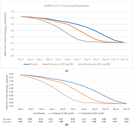SARS-CoV-2 viral dynamics. Shown in top panel (a) is the mean SARS-CoV-2 viral load reduction (log10 copies/mL) over time by treatment: placebo (blue), probenecid 1000 mg b.i.d. (gray), and probenecid 500 mg b.i.d. (orange). Shown in the lower panel (b) is the least squares mean change from baseline in SARS-CoV-2 RNA (log10 copies/mL) by treatment: placebo (blue), probenecid 1000 mg b.i.d. (gray), and probenecid 500 mg b.i.d. (orange).