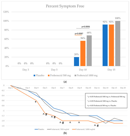 All of the patients with symptoms present at baseline reported symptoms on day 3 and day 5. At day 10, a significantly higher proportion of the patients receiving probenecid 1000 mg had resolved symptoms versus placebo (68%, [95% CI 46.5–85.1%] vs. 20%, [95% CI 6.8–40.7%]; log-rank p = 0.0006). In addition, a significantly higher proportion of the patients receiving probenecid 500 mg achieved symptom resolution versus placebo (56%, [95% CI 34.9–75.6%] vs. 20%, [95% CI 6.8–40.7%]; log-rank p = 0.0087). The symptom resolution difference between probenecid dose levels was not significantly different. All of the patients receiving probenecid 1000 mg had all of their symptoms completely resolved by day 15, with all of the patients in the probenecid 500 mg and placebo-treated groups reporting the complete resolution of symptoms by day 18. Data are shown in Figure 3a.