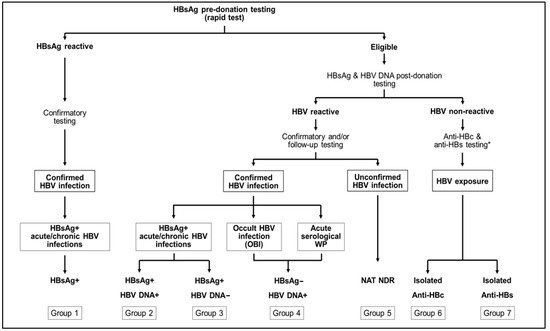 Schematic representation of the HBV testing and confirmation algorithms implemented at Dalian Blood Center. Seven groups of donors were identified with confirmed HBV infection pre or post donation (groups 1–4), suspected but unconfirmed HBV infection (group 5), or potential HBV exposure with no replicative infection (groups 6 and 7). * Testing performed as part of specific retrospective studies.