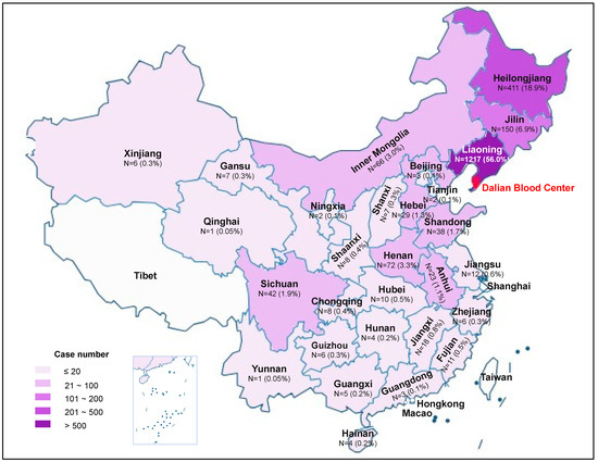 Distribution and geographic origins of 2175 candidate blood donors enrolled in the study and tested for HDV at Dalian Blood Center. The map was developed online at the official website of Standard Map Service System of China (http://bzdt.ch.mnr.gov.cn/index.html (accessed on 18 June 2023)).