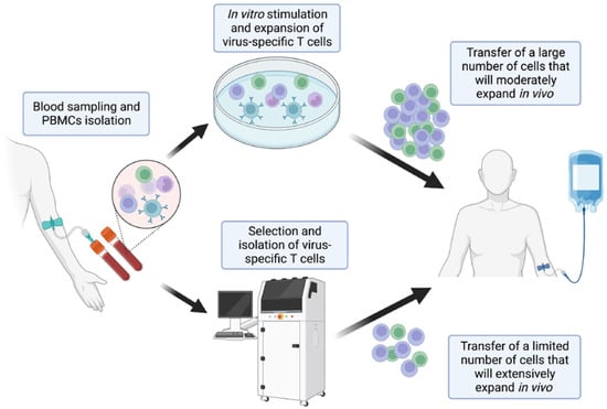 The first clinical experience of T-cell transfer for the treatment of an opportunistic infection (more precisely in this case, of a virus-induced neoplasm) was reported in the 1990s when donor lymphocyte infusions (DLIs) were used in allogeneic hematopoietic stem cell transplantation (HSCT) recipients to treat EBV-associated post-transplant lymphoproliferative disorders (PTLDs) [9]. Although promising, DLIs were not specific to any epitope and, therefore, were associated with a significant risk of graft-versus-host disease (GvHD) occurrence [10]. Since then, two main paradigms have been developed to isolate or enrich virus-specific T-cells: the expansion of virus-specific cells in vitro before infusion and the selection of virus-specific cells that will expand in vivo after infusion (Figure 1) [11].