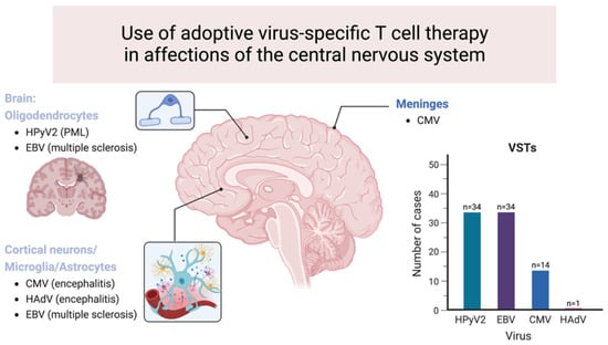 With the rising number of patients being under immunosuppressive treatments for autoimmune diseases or organ transplantation as well as with the growing life expectancy of individuals with hematological malignancies and solid cancers, opportunistic infections of the central nervous system (CNS) cause significant morbidity and mortality [1,2]. Indeed, even in high-income countries, these CNS opportunistic infections continue to carry a particularly poor prognosis, as highlighted by a recent French study published in 2023 reporting a one-year mortality rate of 38.2% for patients diagnosed with progressive multifocal leukoencephalopathy (PML) between 2008 and 2017 [3]. CNS infections in immunocompromised patients raise several diagnostic challenges, including the possible lack of typical infectious features such as fever or increased white blood cell count in the cerebrospinal fluid (CSF) in individuals with cytopenia, the frequent multiple concurrent infections, the virulence of usually harmless pathogens, and the multitude of possible differential diagnoses, including drug toxicities [1,2]. Moreover, the treatment of CNS opportunistic viral infections is challenging because no antiviral treatment has been proven effective in clinical settings, apart from human immunodeficiency virus (HIV) and some herpesviruses [4]. Hence, the sustained control of opportunistic CNS viral infections typically relies on the ability to restore adequate antiviral immunity [3,5]. In this context, new treatment paradigms which aimed at restoring this antiviral immune activity have been developed, including adoptive virus-specific T-cell transfer. In contrast to old beliefs that CNS immune privileged status prevented it from T-cell entrance, it is now established that T-cells can enter and traffic into the CNS, either through the choroid plexus or through the blood–brain barrier and the glia limitans, both in basal and inflammatory conditions. This trafficking requires the sequential occurrence of only partially known tightly regulated processes (reviewed earlier in [6,7,8]). Therefore, T-cell trafficking into the CNS should not represent a serious limitation to this treatment strategy. In this manuscript, we first describe the methods used to develop or select virus-specific T-cells and then review the clinical evidence for their use in CNS infections.