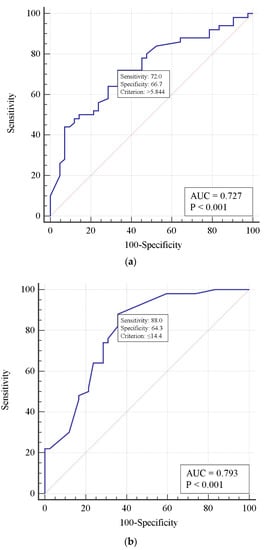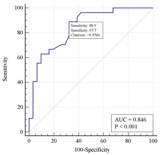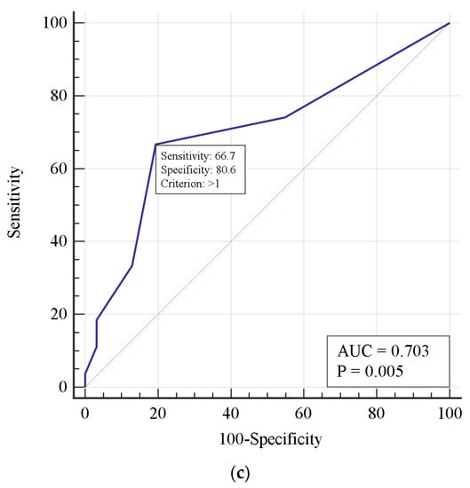 MedCalc® Statistical Software version 20.112 (MedCalc Software Ltd., Ostend, Belgium; https://www.medcalc.org; 2022, accessed on 1 March 2022) was used for the analysis. For quantitative variables, the Shapiro–Wilk test was performed to test for normality. If the distribution was non-normal, the median (Me) and interquartile range (QI-QIII) were calculated, and non-parametric methods were chosen for further data analysis. The Kruskal–Wallis test was used to compare quantitative characteristics between the groups. For pairwise comparison, Dunn’s test was used. For qualitative variables, occurrence (%) was calculated. For the comparison of categorical variables, the chi-square test was used, and for pairwise comparisons of subgroups, the Bonferroni correction was performed. Logistic regression analyses and odds ratios (OR) with a 95% confidence interval (CI) were used to evaluate the effect of factors on the phenomenon being studied. The predictive accuracy of the model was assessed by the area under the curve (AUC) of the receiver operating characteristic (ROC), and its 95% CI was calculated. The p-value < 0.05 was considered significant for all analyses.