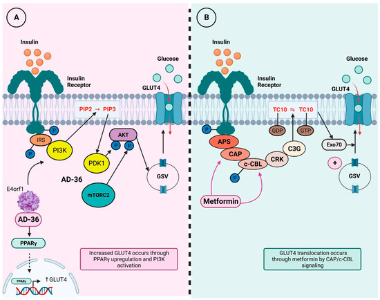 GLUT4 translocation through AD-36 and metformin. Insulin binding to its receptor activates a signaling pathway first regulated by a series of phosphorylation and then by adaptor protein recruitment; this pathway ultimately ends in GLUT4 translocation to cell membrane, which promotes glucose internalization. Abbreviations: IRS = insulin receptor substrate; PI3K = phosphoinositide 3-kinase; PIP2 = phosphatidylinositol-4,5-bisphosphate; PIP3 = phosphatidylinositol-3,4,5-trisphosphate; PDK1 = phosphoinositide-dependent kinase 1; Akt = protein kinase B; mTORC2 = mammalian target of rapamycin 2; AD-36 = adenovirus-36; e4orf1 = E4 open reading frame 1; PPAR-g = peroxisome proliferator-activated receptor-γ; GSV = GLUT4 storage vesicles; GLUT4 = glucotransporter 4; APS = adapter protein containing PH and SH2 domains; CAP = CBL-associated protein; c-CBL = cellular homolog of the transforming v-Cbl oncogene; CRK = adaptor protein CRK; C3G = guanine exchange factor C3G; TC10 = small GTP-binding protein TC10; Exo70 = subunit 70 of exocist complex. Modified from Sayem, 2018 [22]. (A). In vitro models have shown AD-36 interacts with insulin pathway and induces GLUT4 translocation through PPARγ upregulation, which favors GLUT4 transcription. Moreover, AD-36 E4orf1 gene also activates PI3K signaling and leads to GLUT4 translocation to cell membrane. (B). On the other hand, metformin intervenes in insulin signaling pathway in a different mechanism; it regulates CAP and c-CBL proteins and increases GLUT4 translocation from GSV to membrane.