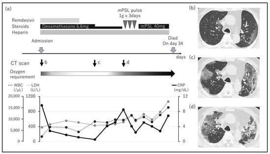 The clinical course of a patient who died of COVID-19. (a) The clinical course of a patient who died of COVID-19 caused by the Omicron variant. On arrival, the patient was diagnosed with severe disease. Five days of remdesivir and 7 days of high-dose dexamethasone improved respiratory disorder and eliminated oxygen requirement. COVID-19 exacerbated after dose reduction in dexamethasone. Despite intensive therapy including steroid pulse, the patient died on day 34. (b) CT images on arrival. A focal ground-glass opacity is observed in the upper left lobe. (c) CT images on day 10. The ground-glass opacity had spread. It was diagnosed to be a healing process. (d) CT images on day 21. Widespread ground-glass opacities were diagnosed as the progression of COVID-19.