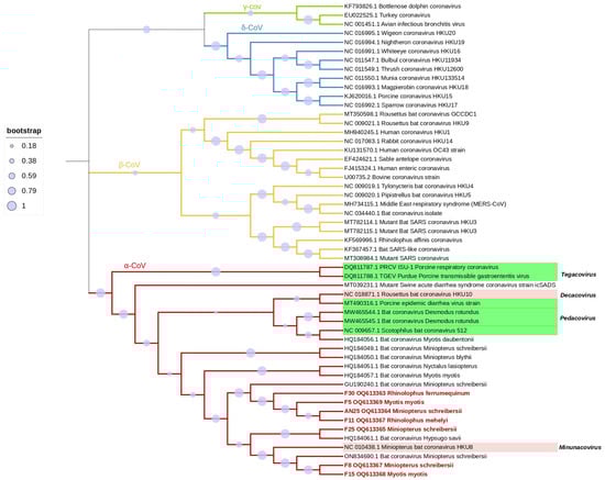 Phylogenetic tree constructed for the alpha, beta, gamma, deltacoronavirus and the alphacoronaviruses subgenus indicated in green and pink, using 46 reference strains and 7 strains identified in this study. Phylogenetic analysis was based on a 406 nt partial region of the RdRp. The tree was constructed using MEGA 11 and using the maximum likelihood based on the GTR + G + I model, and 1000 bootstraps were replicated. Samples from this study are indicated in red with the description of sample number, GenBank accession number and host bat species.