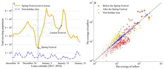 National traffic flow during the Spring Festival travel season and the non-holiday time in 2018. (A) The total traveling population during the Spring Festival holidays (Orange) and non-holidays (Blue). The dates on the x-axis correspond to the orange lines (Spring Festival travel season), and the blue line corresponds to the traffic flow from 20 November to 29 December 2018 without holidays. (B) The average outflow and inflow of each city before the Spring Festival and after the Spring Festival during the Spring Festival travel season, and during the non-holiday time.