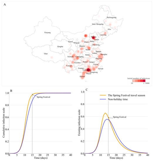 (A) The distribution of the initial seed of infection nationwide (darker colors indicate a larger initial infection size). (B) Cumulative infection scale and (C) existing infection scale over time for Spring Festival travel season and non-holiday time nationwide.