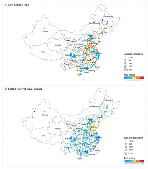Peak timing in each city during (A) non-holiday time and (B) Spring Festival travel season. The unit of resident population is 10,000 people. The unit of peak timing is day. Peak timing is calculated as days after the first day in model simulation.