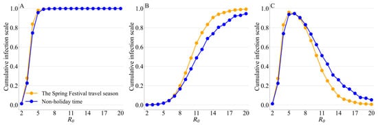 Under the conditions of different R0 and using the reported infection on 17 December 2022 as the initial seeds, the cumulative infection scale of (A) Spring Festival travel season, (B) pre-Spring Festival, and (C) post-Spring Festival. The blue line is the result of the same number of days of non-holiday time.