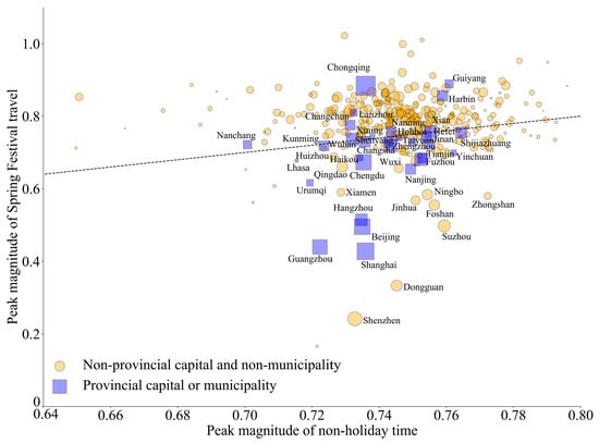 Peak magnitude in each city during non-holiday time and Spring Festival travel season. Peak magnitude is calculated as the fraction of active infections among residential population at peak timing. The size of the node indicates the number of residential populations. Blue squares are provincial capitals or municipalities. The dotted line is the diagonal line y = x. Note that peak magnitude can be greater than 1 because the number of infections in the city can be larger than residential populations due to influx from other cities.