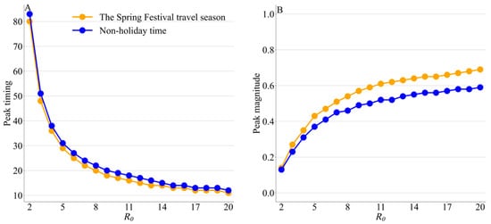 Under the conditions of different R0, (A) peak timing and (B) peak magnitude of the whole country during the non-holiday time and the Spring Festival travel season. The unit of peak timing is the day.