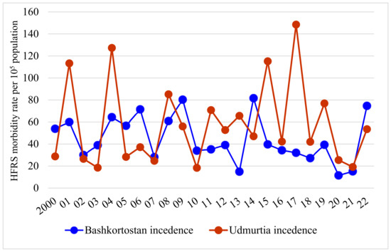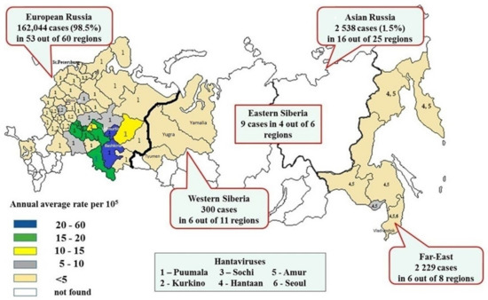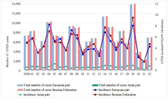 During 2000–2022, a total of 69 of Russia’s 85 administrative regions reported 164,580 HFRS cases, with an annual average rate of 4.9 cases per 105 popul. [15] (Table 1).
