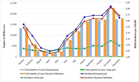 Though most of HFRS cases in Russia occurred during autumn and winter, the infection was persistent all throughout the year (Figure 4).