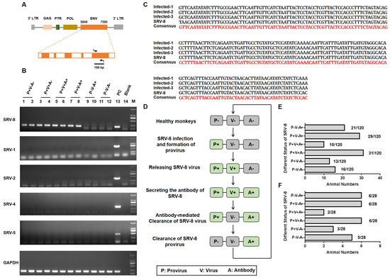 2.7. Detection of Viremia, Proviral DNA, and Antibodies of SRV-8 in 28 Live Monkeys