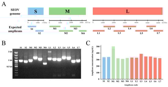 Graphical summary of the universal primer sets and the results of Seoul virus (SEOV) genome amplification. (A) The expected size and location of amplicons on the SEOV S, M, and L genomes. (B) PCR results of SEOV 80–39 genome amplification. (C) The amplification efficiency bias of each primer pair for SEOV.