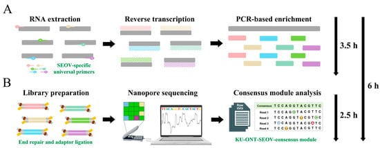 Time-span workflow overview of the one-step RT-PCR-based nanopore sequencing for whole-genome sequencing of Seoul virus (SEOV) within 6 h. The end-to-end workflow included two primary phases: (A) the one-step RT-PCR for SEOV genome enrichment from total RNA extraction within the first 3.5 h; (B) the high-accuracy nanopore sequencing for SEOV using the KU-ONT-SEOV-consensus module within the next 2.5 h. RT-PCR: reverse-transcription polymerase chain reaction.