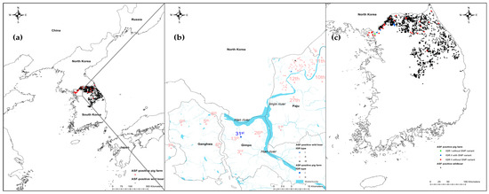 South Korea reported its first case of ASF at a pig farm in Paju City on 16 September 2019. By 9 October 2019, 14 cases had been detected in the northwestern border region. The most affected administrative districts were Paju City (five cases) and Ganghwa County (five cases), followed by Gimpo City (two cases) and Yeoncheon County (two cases) [6]. The proactive control measures taken by veterinary authorities, including the pre-emptive slaughtering and culling of all pigs on farms in the affected regions and the prohibition of swill feeding in pig farms nationwide, contributed to reducing the number of ASF outbreaks and decreased the possibility of further transmission to other regions [7].