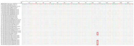 Analysis of IGRs between A179L and A137R (IGRA179L-A137R) of the 36 ASFV strains isolated from pig farms during 2019–April 2023. The ASFV strains from the 26th, 27th, 33rd, 34th, 35th, and 36th pig premises had a substitution of a single nucleotide from A to G at position 107 from the start of IGRA179L-A137R, corresponding to position 55405 in Georgia 2007/1.