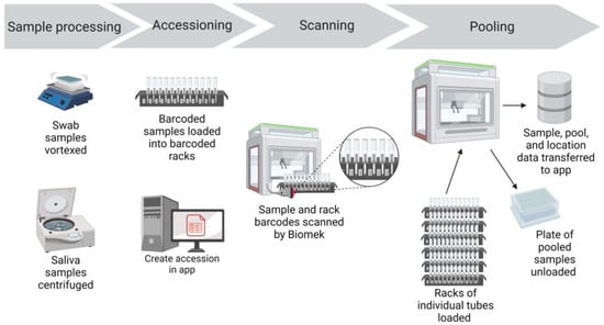 From the Biomek launcher software, the appropriate method was selected for the run (pooling or individual sample transfer, swabs, or saliva). The methods scripts were custom-designed using Python scripts and consisted of step-based workflows used by the Biomek liquid handler to process the samples. The first step was to scan the barcode label on the 96-deep-well sample plate, identifying the accession number that was created at the beginning of the workflow. Initiating and running the Biomek method step launched the Python script, which used the scanned barcode to connect to the LIMS database and determine the number of samples to be pooled or transferred. The Python script then updated the DART reports generated using Biomek. The reports specified the number of samples to be processed and which samples would be pooled into each well of the 96-deep-well plate. A full plate had 465 samples, pooled in groups of 5 samples per well (185 µL of each sample), thus creating 93 pools. If there were fewer than 465 samples to be scanned and tested that could not be evenly distributed into pools of 5, the final pool would have either 2, 3, or 4 samples. If the final pool was determined to have just one sample, then the script directed that the penultimate pool would have four samples and the final pool would have two samples. During the validation of this assay, the limit of detection (LOD) was determined to be 250 genome copies per mL and the diagnostic sensitivity for a pool of 5 samples was 93% [