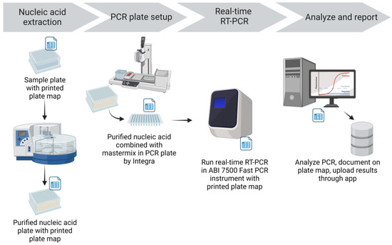 Figure 3). Extraction reagents were aliquoted into 96-deep-well plates in batches in a dedicated area away from the sample processing and extraction areas. Integra Assist Plus pipetting robots (Integra Biosciences Corp., Hudson, NH, USA) with 12 channels were used to automate reagent transfer. Eighty percent ethanol for the Wash 2 plate was prepared daily and aliquoted into deep well plates by Integra Assist Plus pipetting robots. Wash 2 (80% ethanol) plates were labeled with the time and date of preparation to ensure they were used within 24 h. Prepared extraction reagent plates were sealed and stored in plastic containers with latched lids. The required amount of binding solution for the number of samples plus 18% overage (to provide sufficient volume for Integra transfer) was aliquoted into 50 mL tubes. As needed, the respective volume of beads was added to the binding solution and mixed by inversion. The tube containing the binding solution and beads was labeled with the time and date to ensure they were used within 24 h. The lot number of the extraction reagents was recorded on a printed extraction reagent recipe sheet and on the PCR plate map.