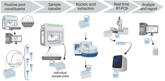 Figure 1). Sample plates were loaded into Kingfisher Flex instruments for automated nucleic acid extraction. SARS-CoV-2 amplification and detection were performed using ABI 7500 Fast real-time PCR instruments. After the analysis of the results, SARS-CoV-2-positive pools were deconvoluted to identify individual positive specimens.